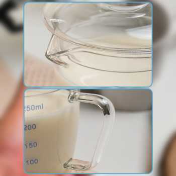 | Material Gelas Tahan Panas Gelas ini terbuat dari kaca khusus yaitu kaca borosilicate yang tahan terhadap perubahan suhu. Anda bisa menggunakan untuk susu panas atau dingin. Gelas ini juga dapat dipanaskan langsung menggunakan kompor api ataupun listrik. Perlu diperhatikan agar mengisi air terlebih dahulu sebelum memanaskan gelas, jika gelas dalam keadaan kosong saat pemanasan maka dapat menyebabkan kaca retak. |